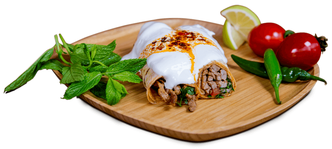 55 Gr. Dana biftek etine yoğurt, toz kırmızı biber, domates, maydanoz, sumaklı soğan ve tuz eklenerek; Roka, k...